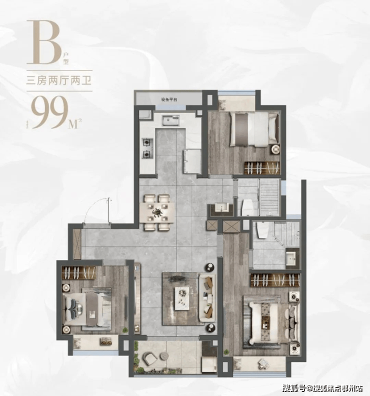 建筑面积约99㎡是备受欢迎的飞机户型。主次卧分列客厅两侧满足“合而不扰”的家庭需求;三开间朝南+南北通透,采光和通风效果双爆棚;客餐厨一线相连,直通南向大尺度观景阳台,空间感和尺度感超乎想象!