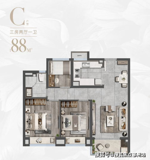 建筑面积约88㎡三房,一步到位满足年轻小家庭及未来需求,绝对是超高性价比的“大虹桥生活入场券”。格局上,该户型做到了三开间朝南,采光非常优异,主次卧附带飘窗,延展空间视野,也提升了空间利用率。