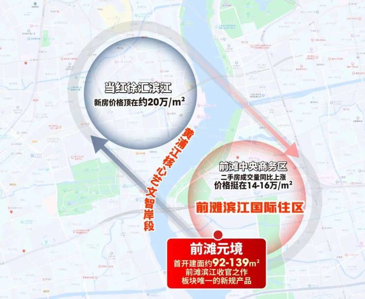 这段江是黄浦江核心段,价值已在新房市场强势兑现。对岸徐汇滨江房价冲击20万/㎡;前滩商务区二手房坚挺,前滩滨江的前滩润璟、百合园、前滩公馆等连开连捷,片区楼市热度居高不下。