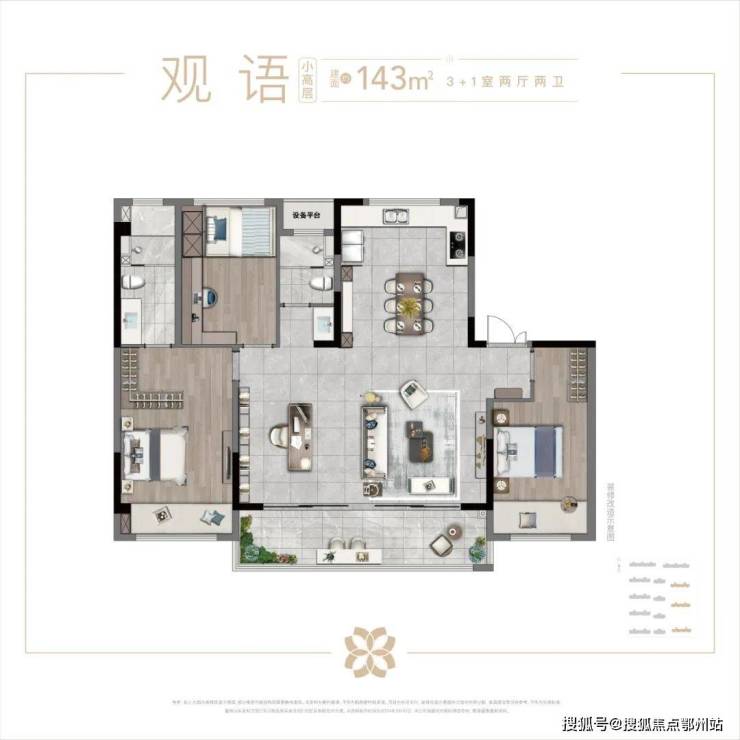 洋房产品设计为大开间、长进深,打造市面少有的奢阔四开间布局,以约15.3-17m尺度面宽,呈现阳光与空间的超尺度配比,尽享大尺度采光面、观景面。