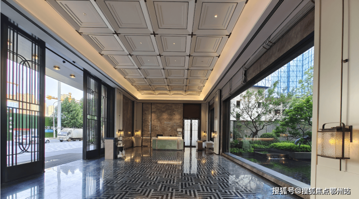 进入社区大堂,低调、奢华的印象更是跃然眼前。从烟雨江南奢石打造的前台背景墙、到搭配经典且采用拼花水刀切割工艺的地面,再加上大堂内约7.4米*3.6米的巨幅玻璃画框,将小区内叠水水景、镜池、园林等融为一体。