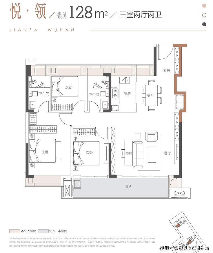 建面约128㎡的3房2厅2卫