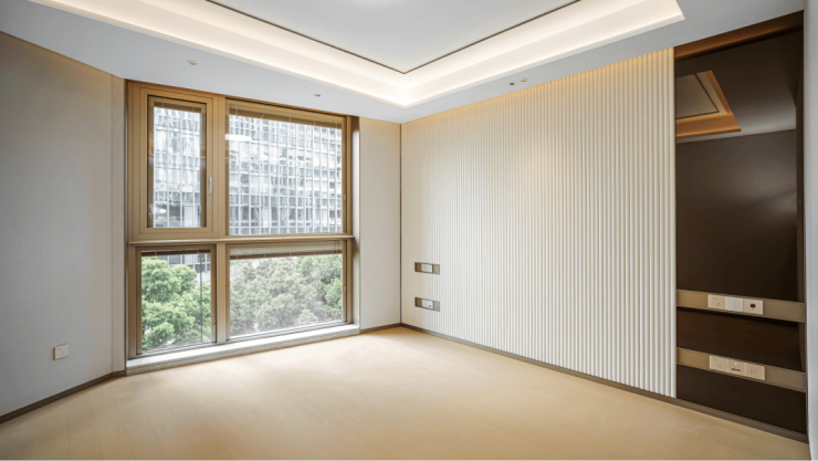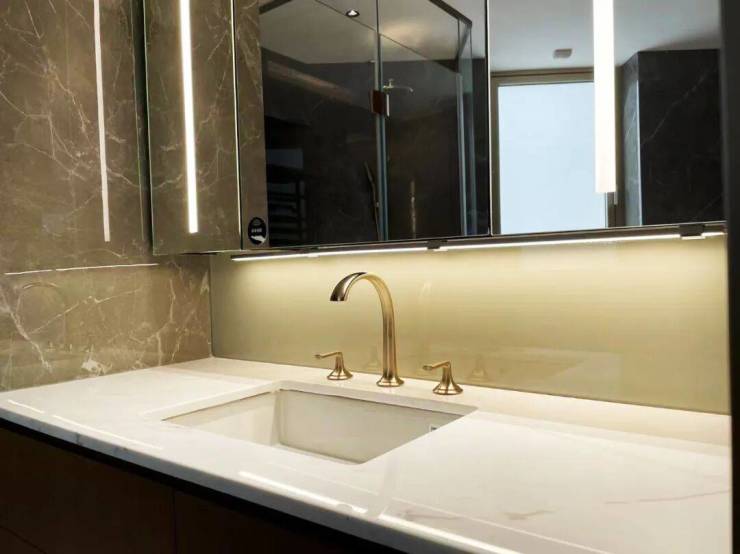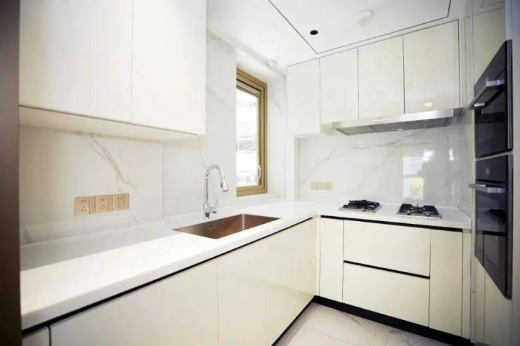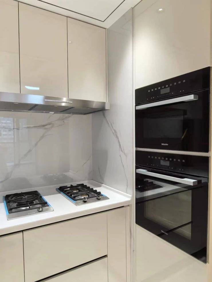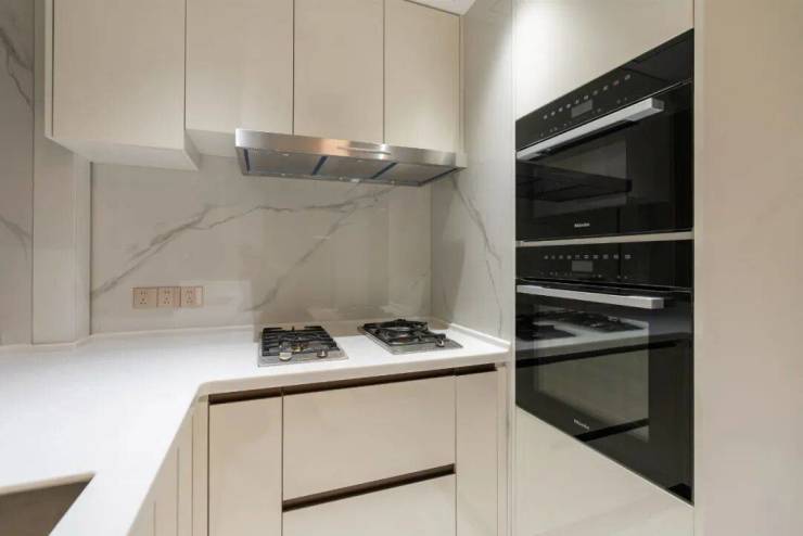 细节方面,项目采用了 拉米娜 的进口电视背景墙、顶级奢侈品牌 卡莉斯塔 的主卫龙头、 ABB 的智能化控制、 LG 的厨房台面,甚至是阳台的 电动晾衣架、水槽、吊柜都是交付标准。