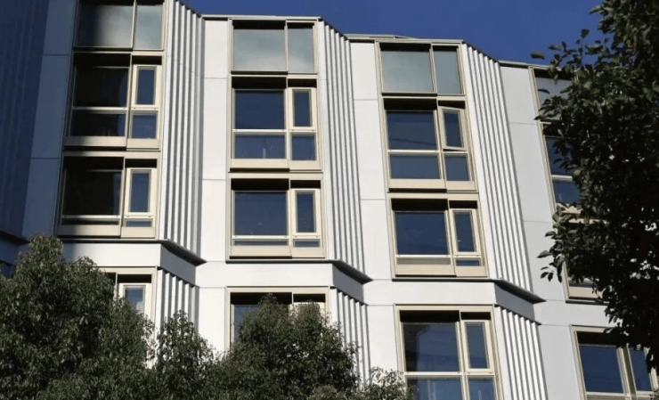 目前从现场观察, 世纪臻邸项目住宅楼栋香槟金窗框+浅灰色铝板的外立面已进入收尾阶段,铝板、门窗等均已安装完毕。