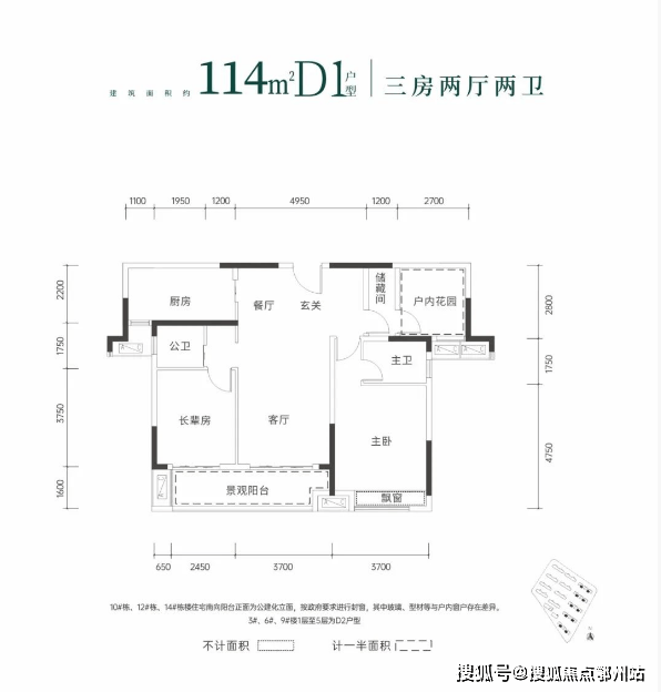 建面约114㎡三房两厅两卫: