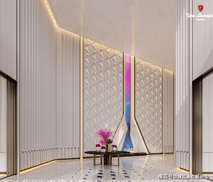 步入挑高约11米的一楼大堂,折线通高墙面与钻石切割前台 ,像极了兰博基尼发动机的散热鳍,又似来到澳门七星级酒店摩珀斯。