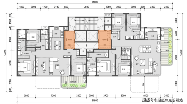 ① 极致梯户比:均为2梯2户布局,可享专梯入户奢华体验,所有户型都是双玄关设计,既保证了入户的私密性,还让等电梯的时间大大缩减。