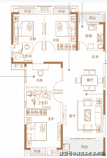 从空间结构上来看,该户型做到了南北通透且三面采光的格局,还设计了南北双阳台,加上多个飘窗,实际优化后得房率不输当下部分准四代。