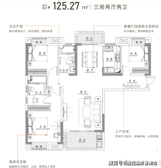 如果没有四房需求,建面约125平的三房两卫也相当不错。