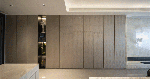 建面约115㎡户型,通过分户墙上的 “S”形设计,利用凹凸墙面,实现两组嵌入柜体。