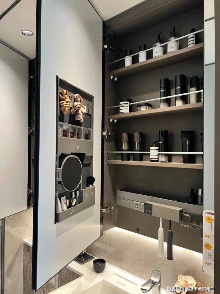 而且你看镜柜立面都非常细节,都有防掉落栏杆,插座,牙刷放置、放大镜等等,全都有!平时的小物件都能收到镜柜里,可以让卫生间台面一直整洁!强迫星人最爱!