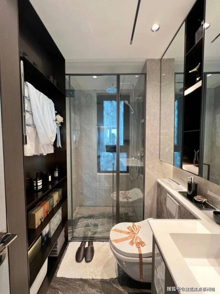 卫生间两面墙的收纳!像平时洗澡没地方放的换洗衣物等,现在都有了归处!镜面全部都是到顶了设计!