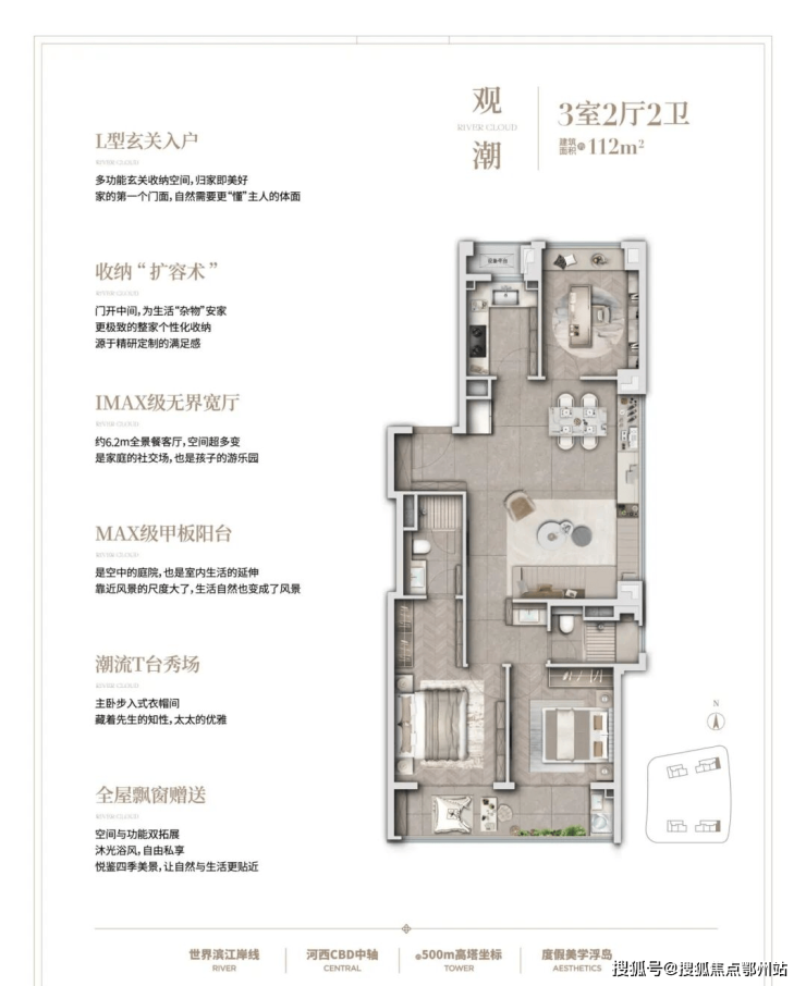 建面约112㎡三室两厅两卫,很多人看完,感觉有“空间魔法”,小户型竟也做到大空间,约6.2米的客厅,更有巨幅落地窗。