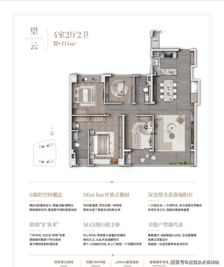 建面约141㎡的四室两厅两卫,这个面积的户型在南京常见,但南向约7米的跑道式阳台,IMX级别的宽厅客厅太少见了。 如此大横厅,尽可纵览河西风景。