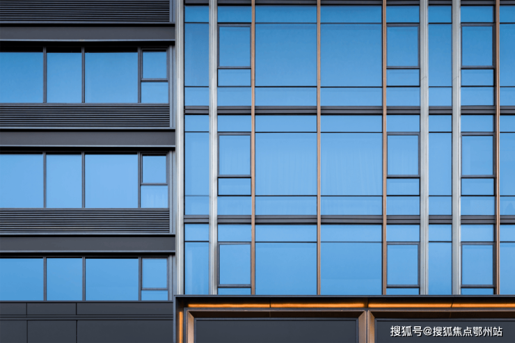 外立面颜值也很高, 是河西首家用幕墙料做门窗的项目,南向窗墙比高达0.68,采用 银灰色铝板+浅蓝灰玻璃,辅以香槟色铝板、香槟翠石材点缀