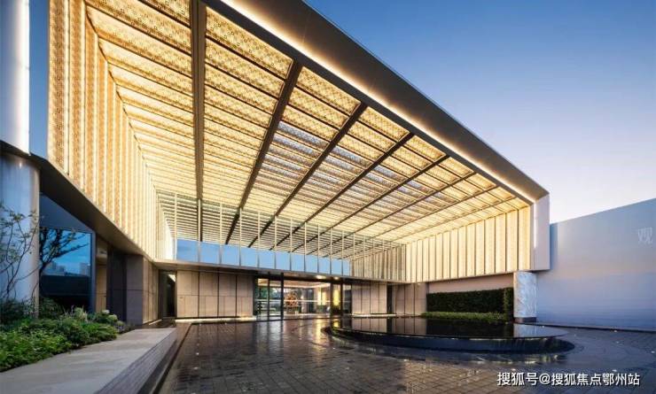 小区大门是 五星级酒店环岛式格局,现场看蛮震撼的,采用铝板、石材、玻璃幕墙等材质