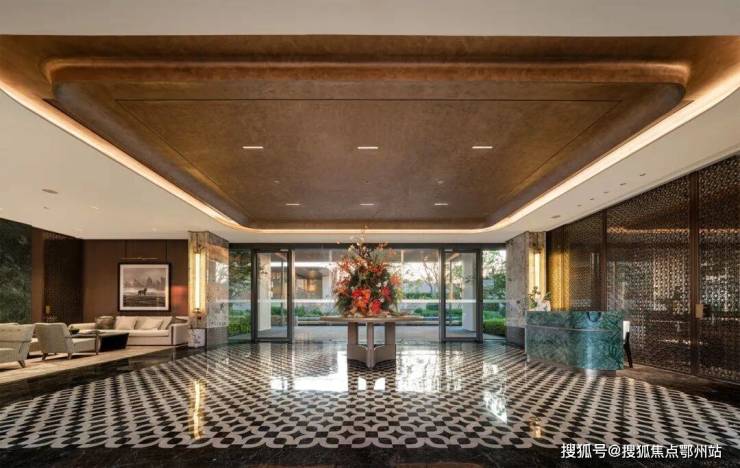大门进去是大堂, 星耀灰+雅柏灰石材拼花地面,帝王绿整面奢石背景墙、连纹雪山飞狐柱体......非常大气,你跟我说这是3万多的楼盘,我是不敢相信的!绝对的豪宅配置