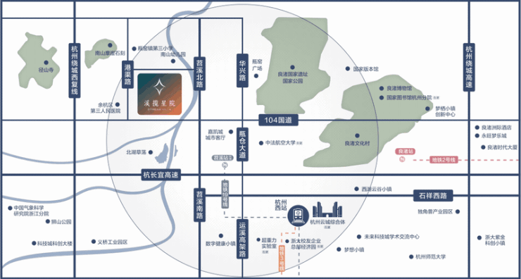这么一描述,大致也能画出溪揽星院所处的地理位置了,就在良渚遗址公园的西侧。往南10多分钟车程,就是杭州的新中心“云城”,往东与良渚新城接壤。