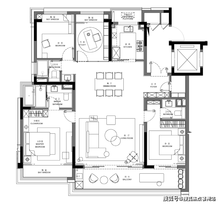 主卧豪华 套房+独立衣帽间+浴缸+270°转角飘窗 ,极致生活享受