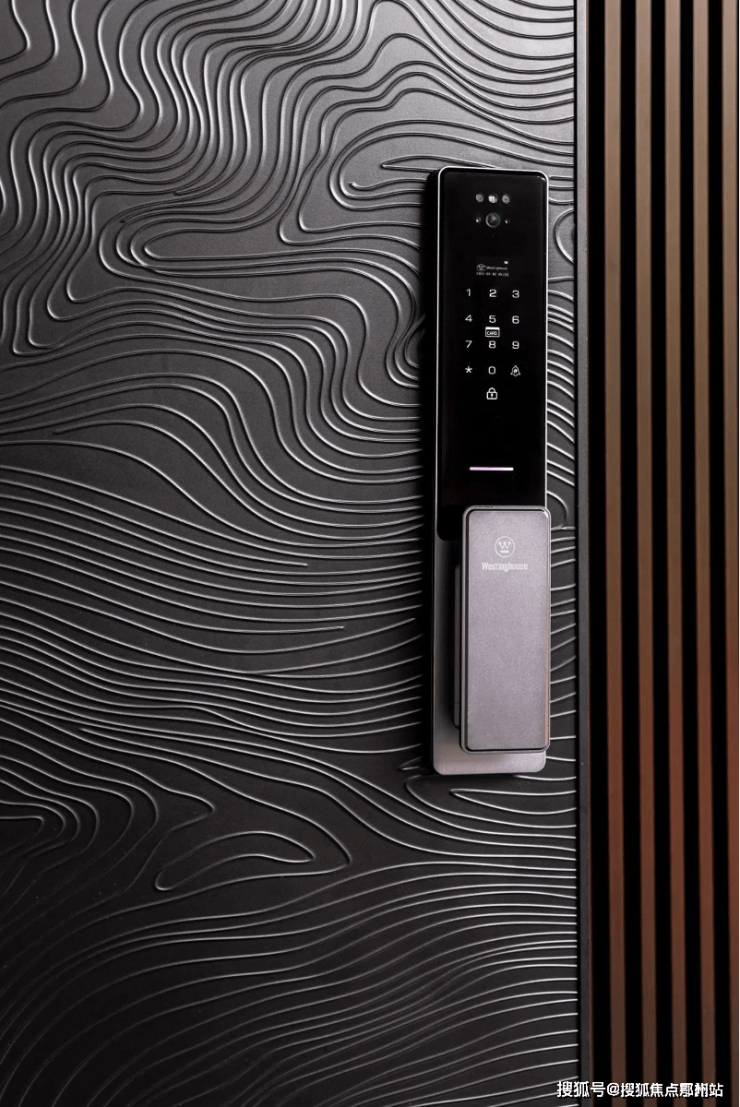 比如,入户就是重工铸铝装甲门 ,水波纹饰面门板,厚度和重量要比普通防盗门厚重很多,搭配智能五合一门锁。
