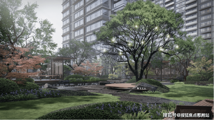 二进礼序花园 ,中庭以记忆大树为中心, 特别打造樟下千灯休憩空间 ,围绕大树设置两排转角长凳,闲坐于此,是属于玺云的独家浪漫。