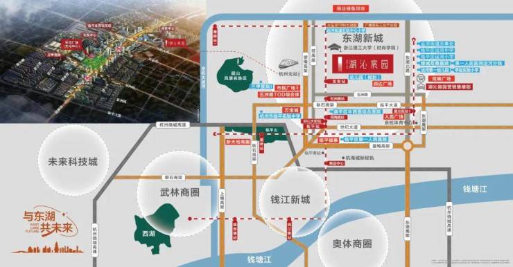 项目位置位于兴元路与东湖北路交叉口,直面运河支流三花港,拥享项目内湖,享受双湖的内外涵养,同时可就近乘坐地铁9号线,速达未来临平高铁北站,紧邻蜗牛广场,周边教育医疗生活配套完善。园区打造一轴五境十三景大美园林,精琢互动式的自然生活场景。