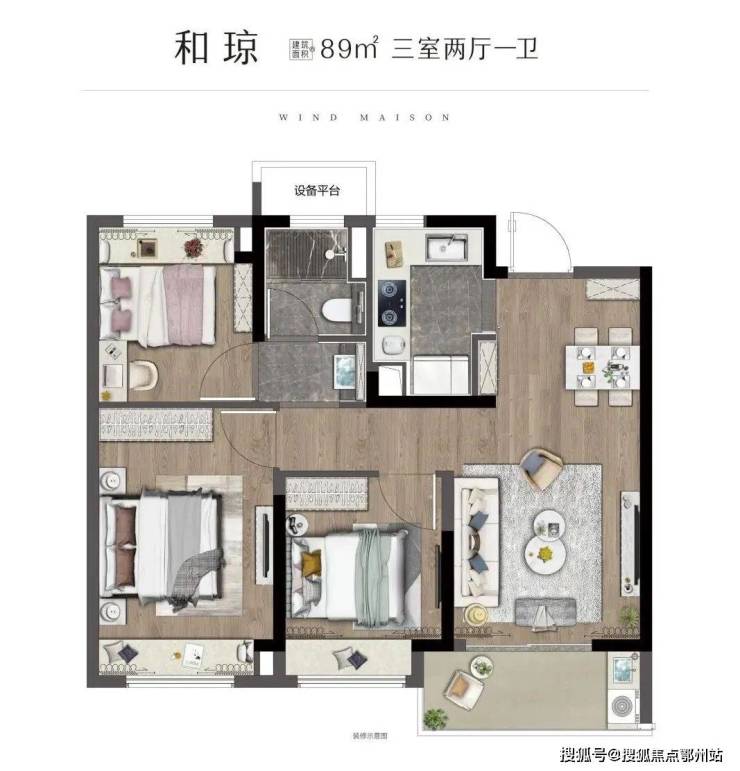 89㎡三居:单价1.65-1.95万/㎡,总价150-165万/套