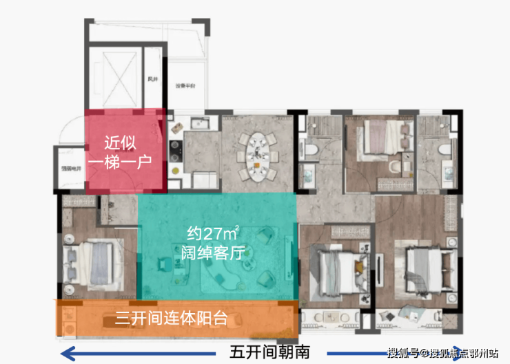 建面约143㎡大四房,约27㎡阔享级客厅,近似一梯一户的设计,私享更多生活空间;五开间朝南,约15.6米超大面宽,三开间连体阳台,同时搭配超大的窗墙比,做到采光与景观视界的更大化。