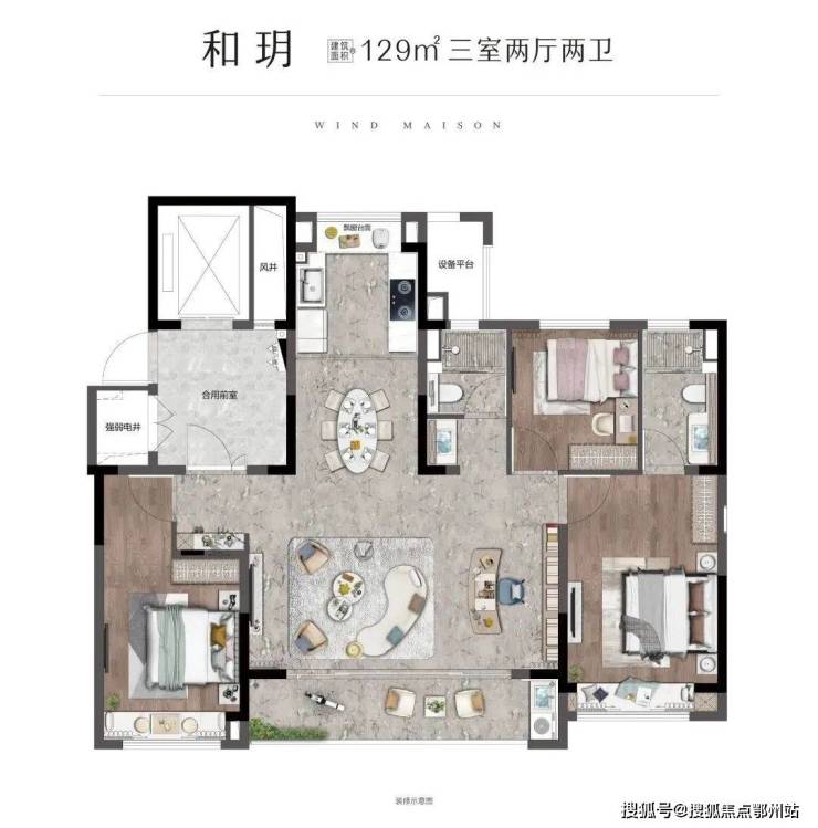 建筑面积约129㎡户型: 全屋约13.3米超大四开间面宽,极致采光体验, 约6.8米开间32㎡面积奢阔横厅,营造“全家庭互动”公共空间,为家人互动体验创造了极佳的场景环境。
