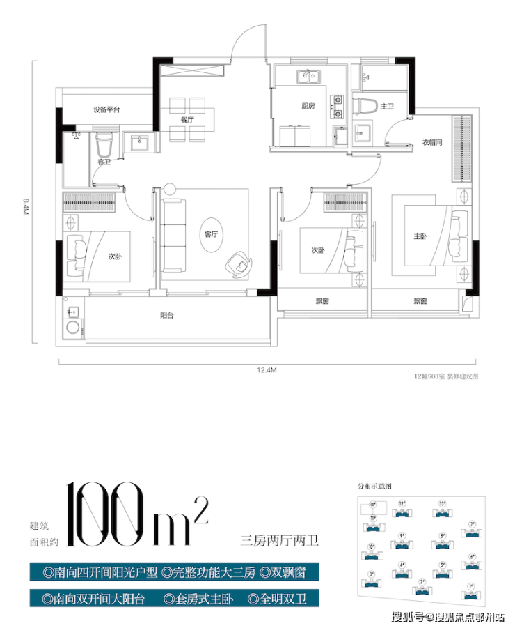 户型:建面约 100m²、105m²、128㎡,限价22240元/㎡精装交付,且配置地暖,高层12-17F,总户数768户,
