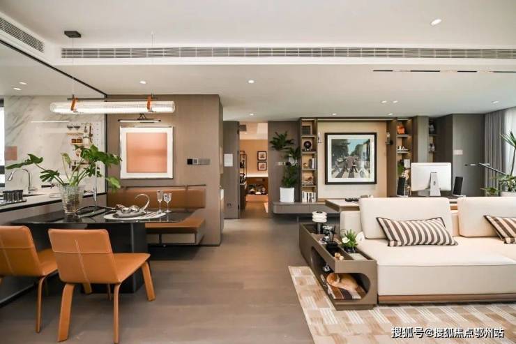 通过玻璃窗将餐客厅和厨房连接起来,从视野上看,餐客厅成了厨房的延伸,LDKB一体化感更强。而且玻璃窗的设计,也是交付标准,住进来后,既不会影响一家人的互动,又能有效阻隔油烟。