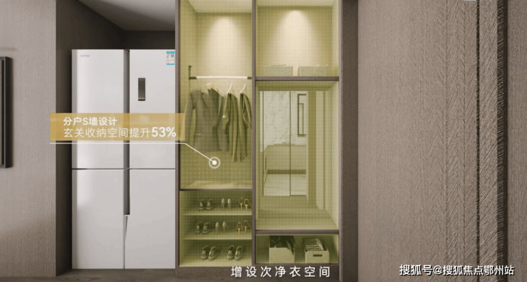 对于小户型来说,大冰箱放哪里一直是难中之难,放厨房太挤,放客厅可能拿取不方便,在这个户型里,樟湾国际在玄关柜旁内嵌了S墙,提前预留了双开门冰箱位置,解放了厨房空间,又与厨房和餐厅形成合理的三角互动动线,让小户型也能完美拥有双开门冰箱。