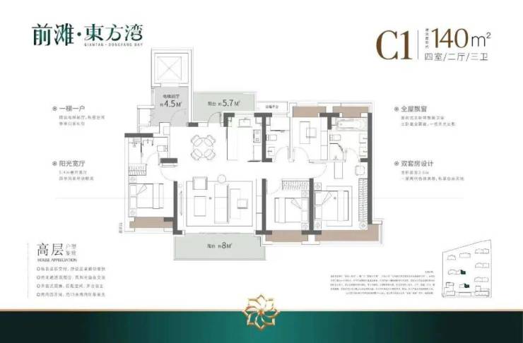 如果有进阶改善置业需求的客户,可以选择 建面约140/175㎡4房2厅3卫!