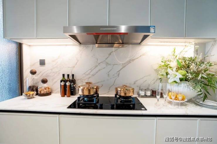 厨房区域标配 美诺6件套 ,涵盖油烟机、灶具、洗碗机、蒸烤一体机、嵌入式冰箱等,搭配 威乃达橱柜 ,厨房”一装封神“!