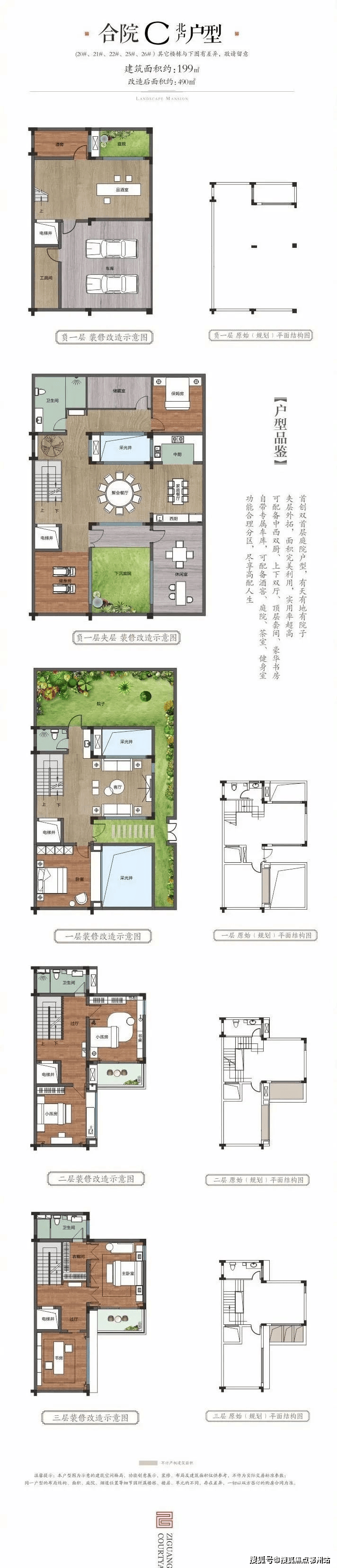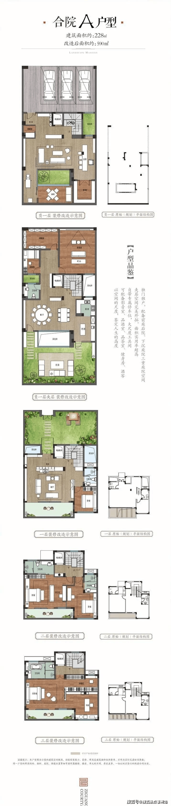 ①A户型买228㎡改造后实用590㎡带130㎡庭院
