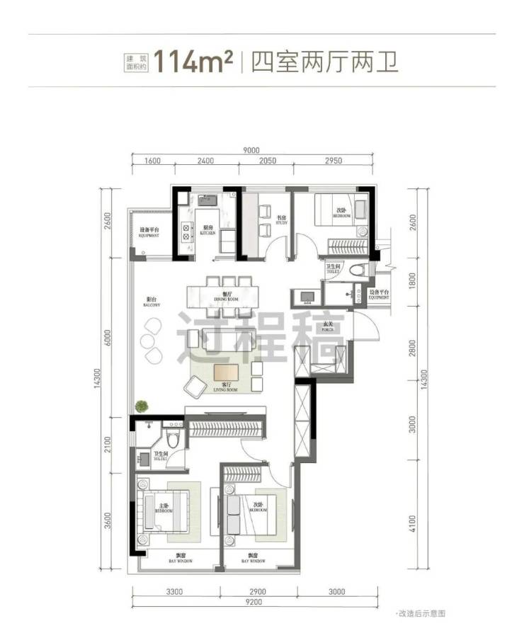 刚改旗舰边套户型:建面约114方四房两卫