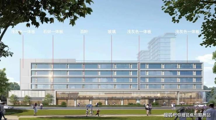 其中, 小高层外立面采用全铝板、石材、石材一体板搭配南向大面积玻璃幕墙;