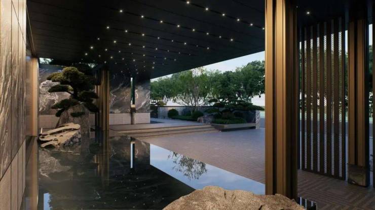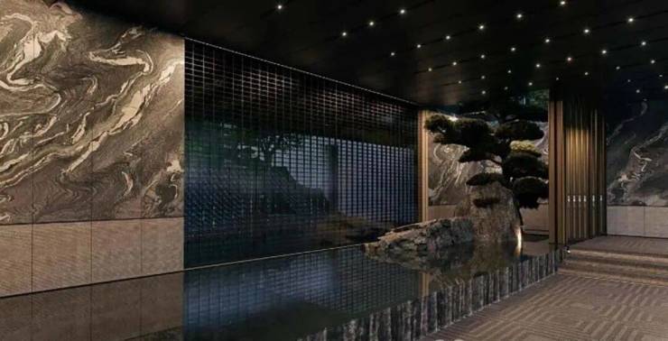 而门口的墙面,更是用大理石与绿植山石装裱出一幅立体的山水画,在垂直立面上演绎“石中有画,画中有境”的宋式空间美学。为了契合宋代织锦的“天华纹”, 泳池对景墙独创了“琉璃錾铜·经纬叠映”的构造,以铜为骨,内嵌玻璃砖墙,用琉璃构建出特殊的“经纬提花”.