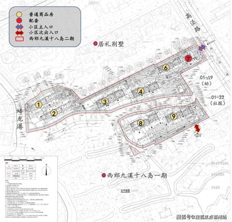 从这次公示的小区总平面图我们可以看到,西郊九溪十八岛二期共有 7个组团构成,它们分别是1-4号,6号,8号,9号,每个组团均规划了 3栋别墅,共 21套别墅。