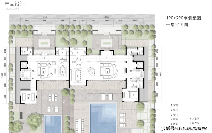 两种入户方式北入户的190+290房型,一层朝南直面庭院和泳池,