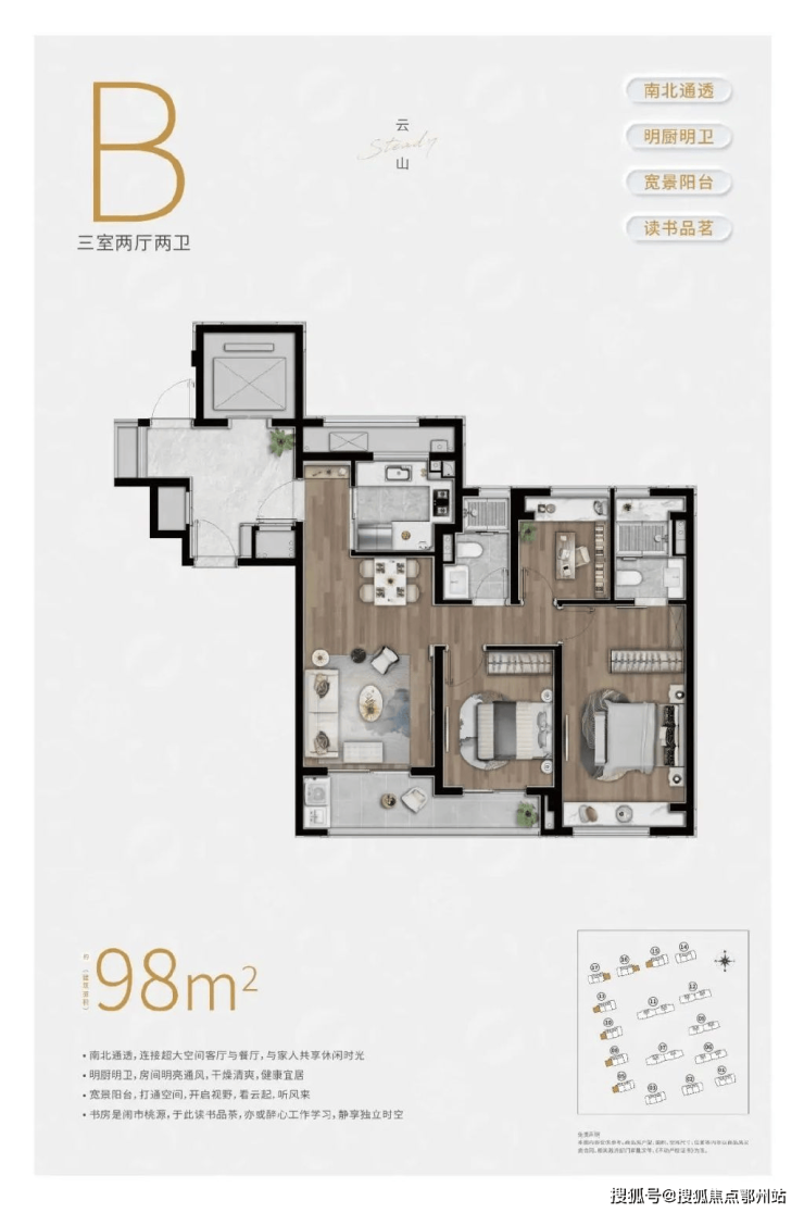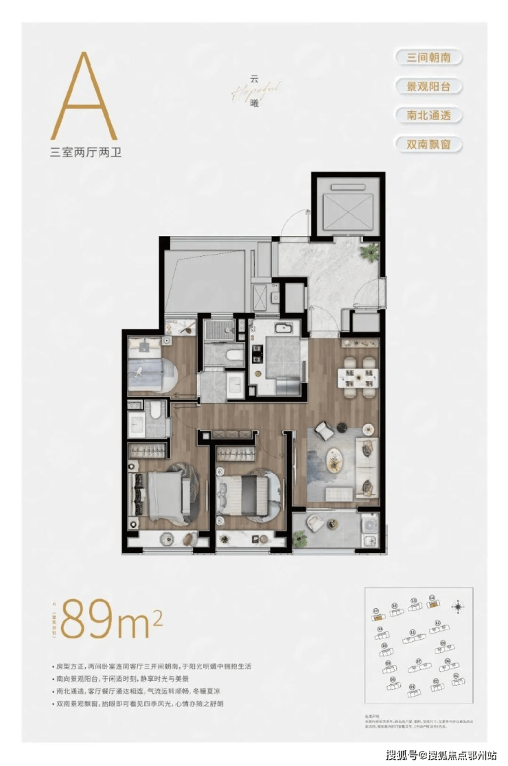 89㎡三房:南北通透,主卧套房设计,干湿分离卫浴,满足年轻家庭的功能需求。
