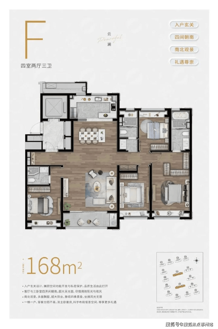 168㎡四房:四面朝南,270°转角飘窗,独立电梯厅入户,彰显改善型生活的私密与尊贵。全屋配备中央空调、地暖、新风系统,厨房与卫浴选用科勒、汉斯格雅等国际品牌,细节处尽显精装品质。