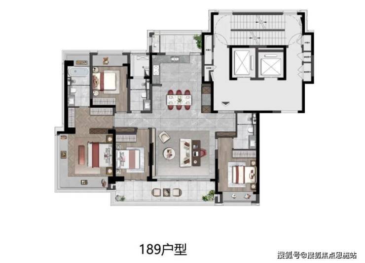 ▲建筑面积约189平四房三卫户型