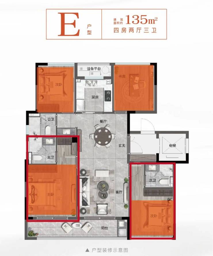 约135㎡户型点评:独立门厅:独立电梯前厅连接独立玄关入户尽显归家礼仪风尚,经典四叶草:奢阔大四房,分散式布局,私密有度彰大宅气度,尊崇双套房:南向卧皆配独立卫浴,同面积段产品,板块祗此,迭代三卫:创领超配设计,隐私主卫,体面客卫,定义富春新改善,环幕通透:三面采光,方正格局,约7.5m巨幕阳台盛载阳光