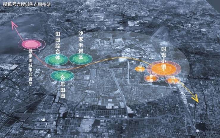 所谓“一镇一浜,二田三市”即是以沙家浜镇水浜资源为基础,打造田园大型体、欢乐田园特色自然观景以及时光小镇内部街市、水市、镇市三市丰富旅游景观。