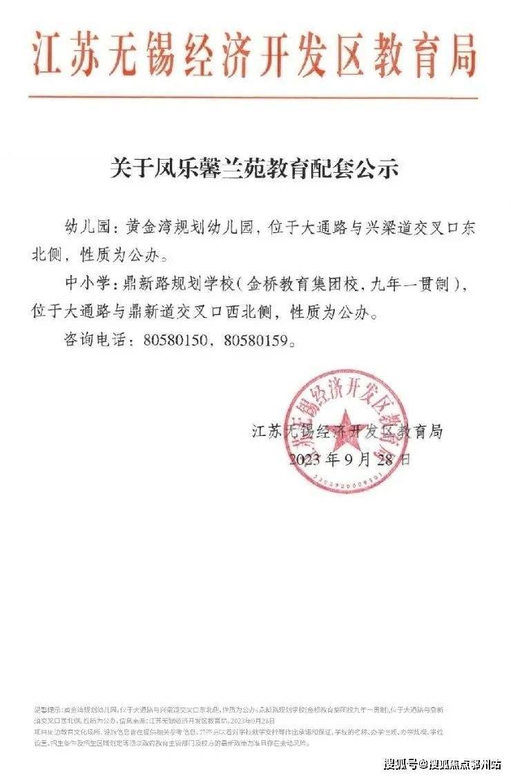 (温馨提示:黄金湾规划幼儿园,位于大通路与兴梁道交叉口东北侧,性质为公办。鼎新路规划学校(金桥教育集团校九年一贯制),位于大通路与鼎新道交叉口西北侧,性质为公办,信息来源:江苏无锡经济开发区教育局,2023年9月28日