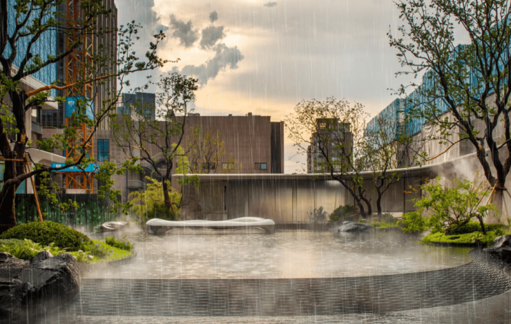 未来, 水系穿行于约800㎡的下沉庭院之间,场景之中,水、灯、石、树、墙等等装饰元素有机结合,每一种 细节元素背后,都有各自所代表的符号语言。