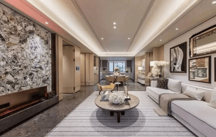 在装饰细节上, 从天花板的曲面吊顶、墙体的圆角过渡,到定制家具的流畅线条,都在诉说喜曲不喜平的优雅,天花吊顶,更有刻槽工艺,融入项目logo,赋予业主独一份的尊崇。