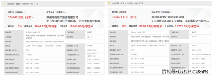苏地2021-WG-74号地块,以底价374346万元成交,楼面价9044元/平;
