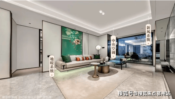 客厅连接观景阳台、餐厅,通透明亮,配置 日立/东芝中央空调(或同档次品牌), AO史密斯/阿里斯顿地暖(或同档次品牌),及 美的/格兰斯柯新风系统(或同档次品牌),多维度多空间多场景气温自调节,以360度温润呵护,打造一个充满新鲜空气的健康环境,让家中每一处空间气温都舒适随心。